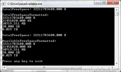 30:     Console .WriteLine("TotalFreeSpace: {0,0:F3} B" ,
