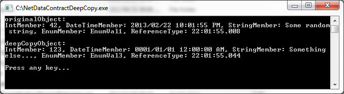 CustomDataType deepCopyObject = originalObject.DeepCopy(); deepCopyObject.DateTimeMember = DateTime.MinValue; deepCopyObject.IntMember = 123; deepCopyObject.StringMember = "Something else...";